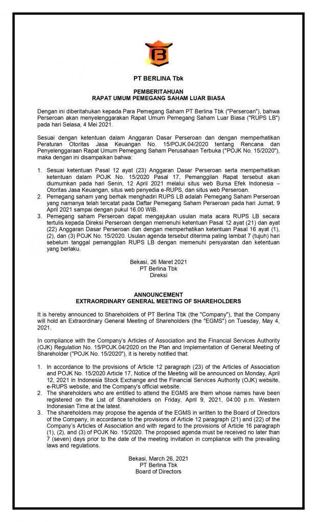 Pemberitahuan Rapat Umum Pemegang Saham Luar Biasa PT Berlina Tbk – 4 Mei 2021