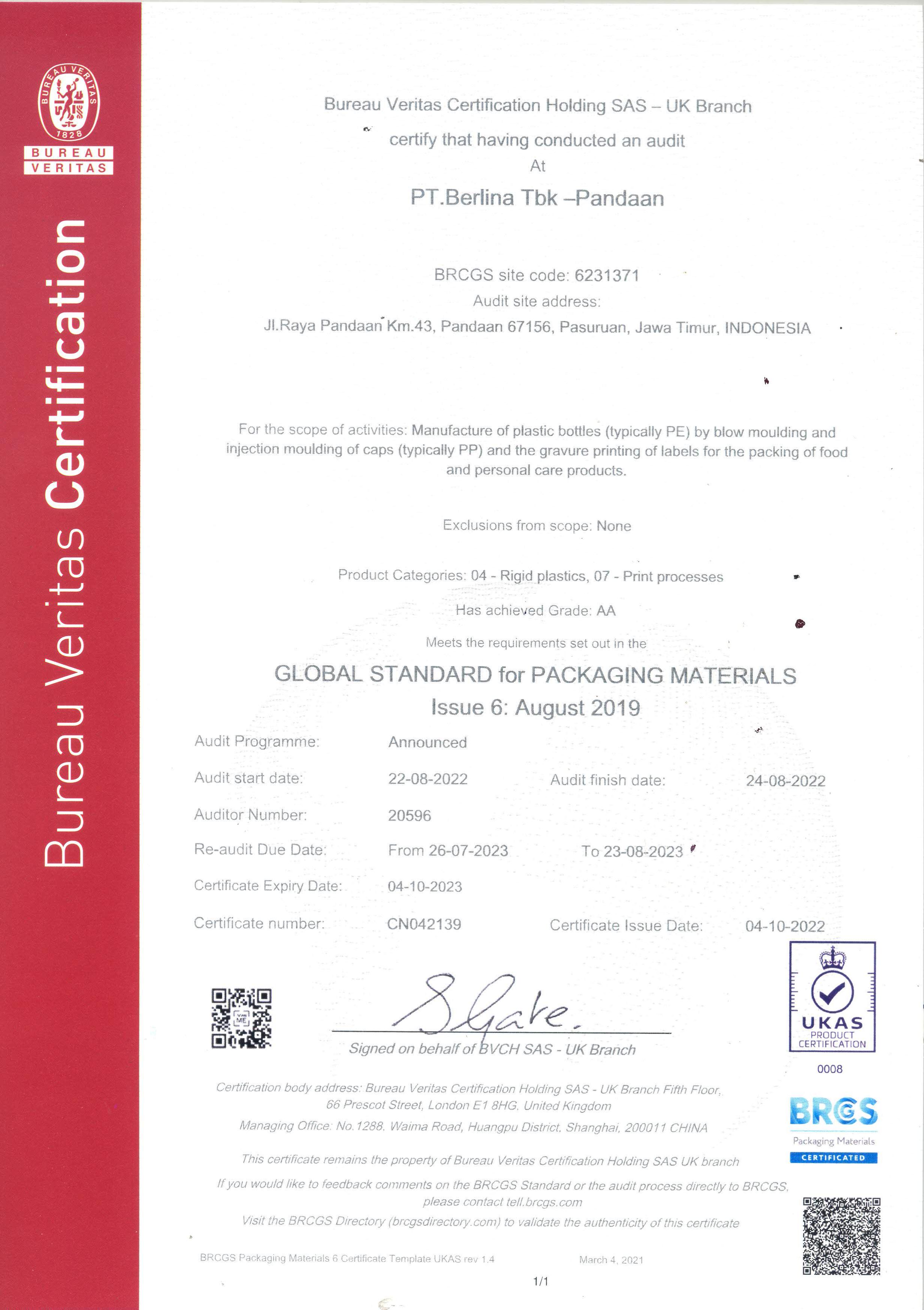 BRC Global Standard for Packaging Materials Issue 6 – CN0042139