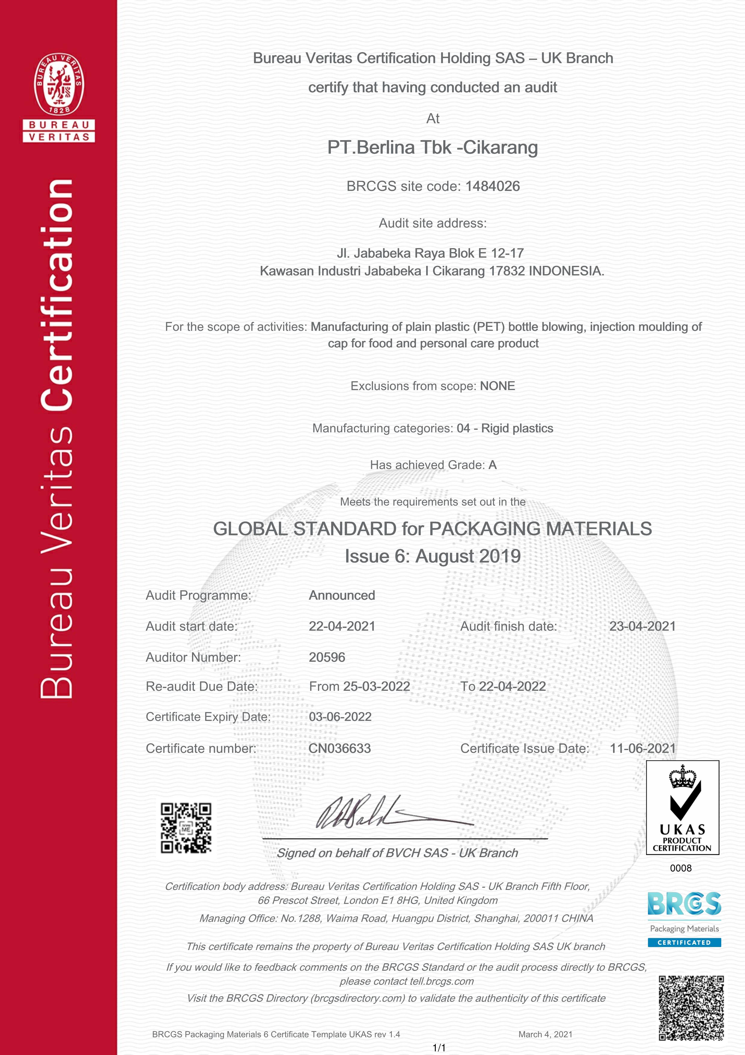 BRC Global Standard for Packaging Materials Issue 6 – CN036633